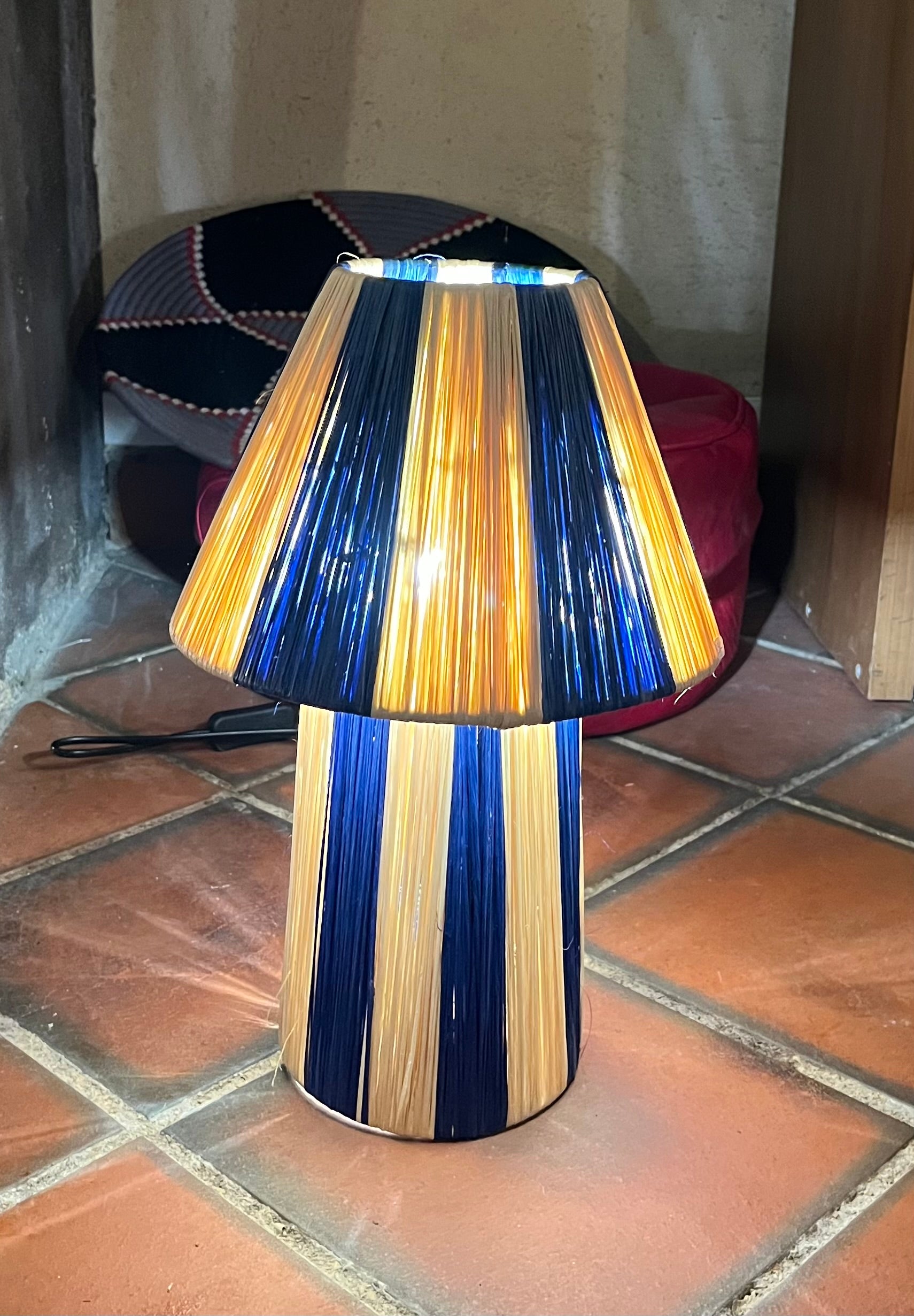 Fabrication : Entièrement réalisés à la main au Maroc, ces abat-jour sont conçus à partir de fibres naturelles soigneusement teintées, séchées puis tressées autour d’une armature en métal. Chaque étape — du traitement de la fibre au tressage final — est effectuée avec précision et passion.