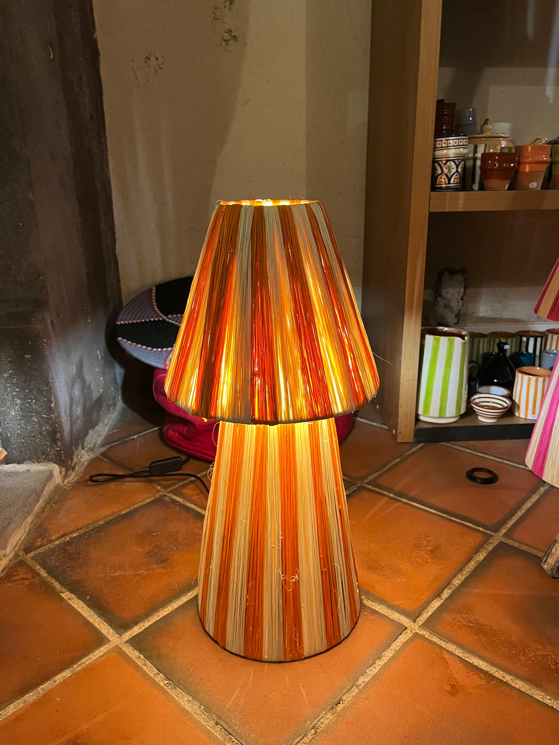 Fabrication : Entièrement réalisés à la main au Maroc, ces abat-jour sont conçus à partir de fibres naturelles soigneusement teintées, séchées puis tressées autour d’une armature en métal. Chaque étape — du traitement de la fibre au tressage final — est effectuée avec précision et passion.