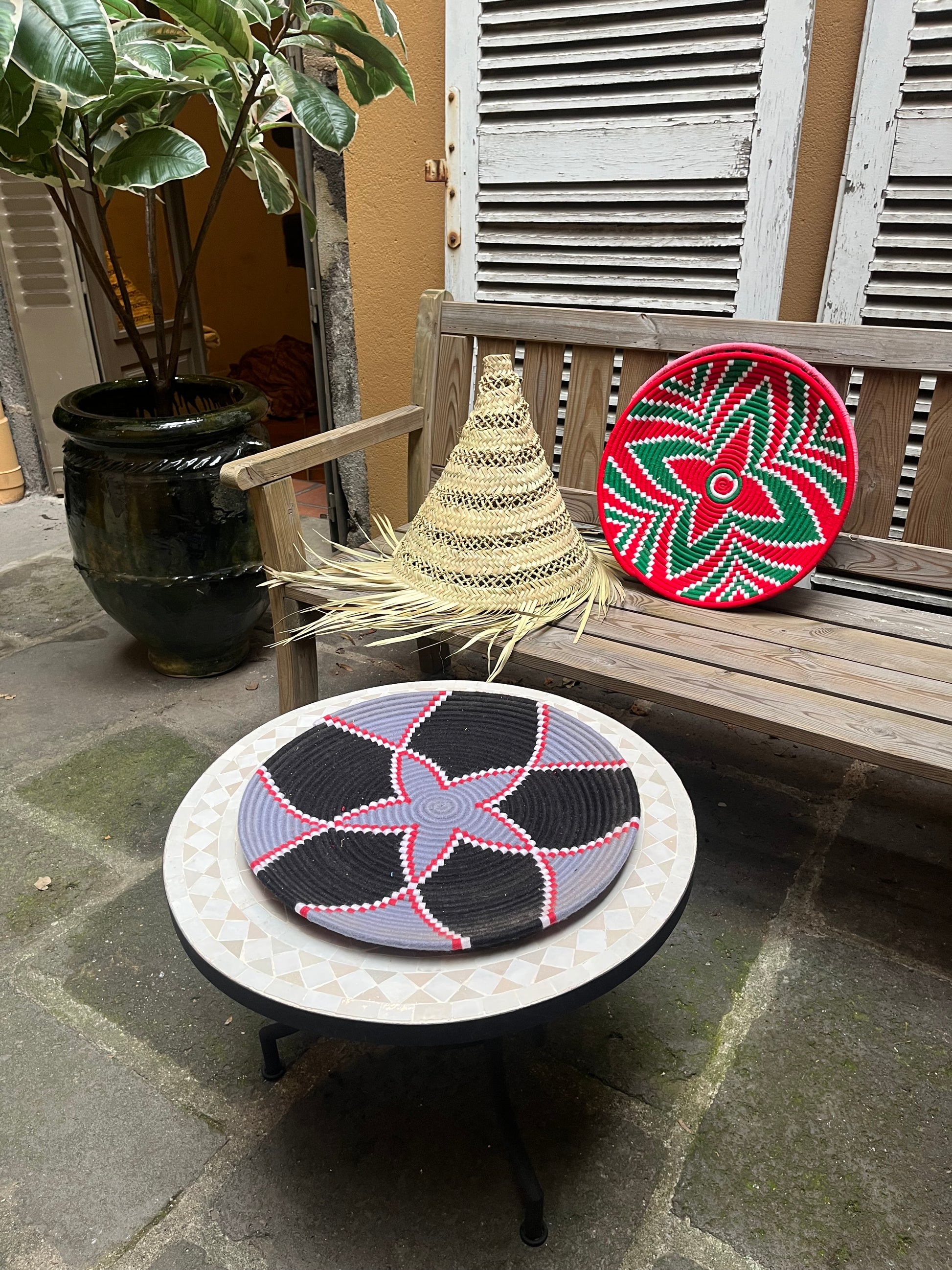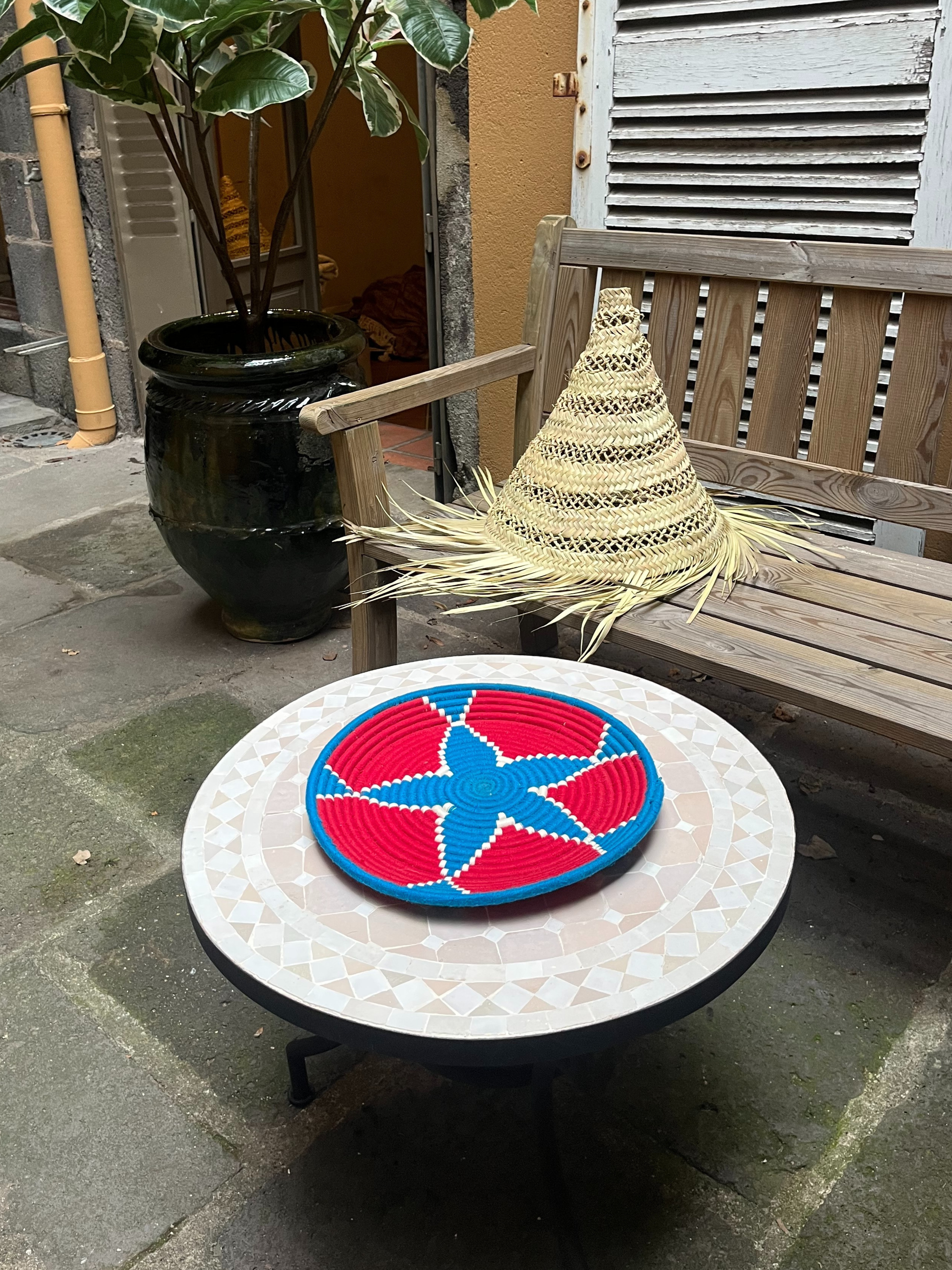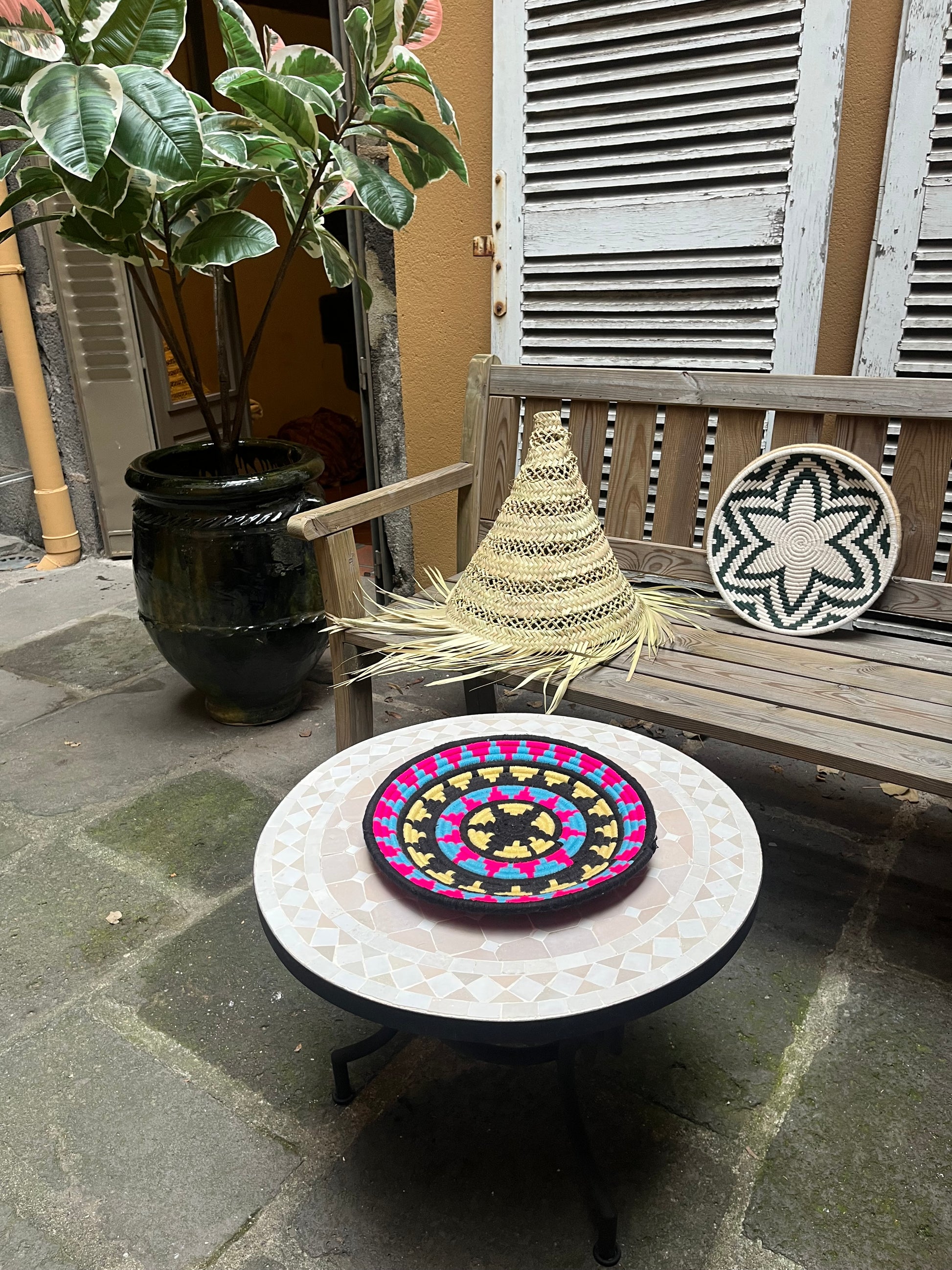 Fabrication : Réalisées à 100 % de manière artisanale au Maroc, ces assiettes sont tissées à la main dans un coton naturel. Les fils colorés sont intégrés directement au tissage pour créer des motifs décoratifs subtils, puis chaque pièce est façonnée et finalisée avec soin.
