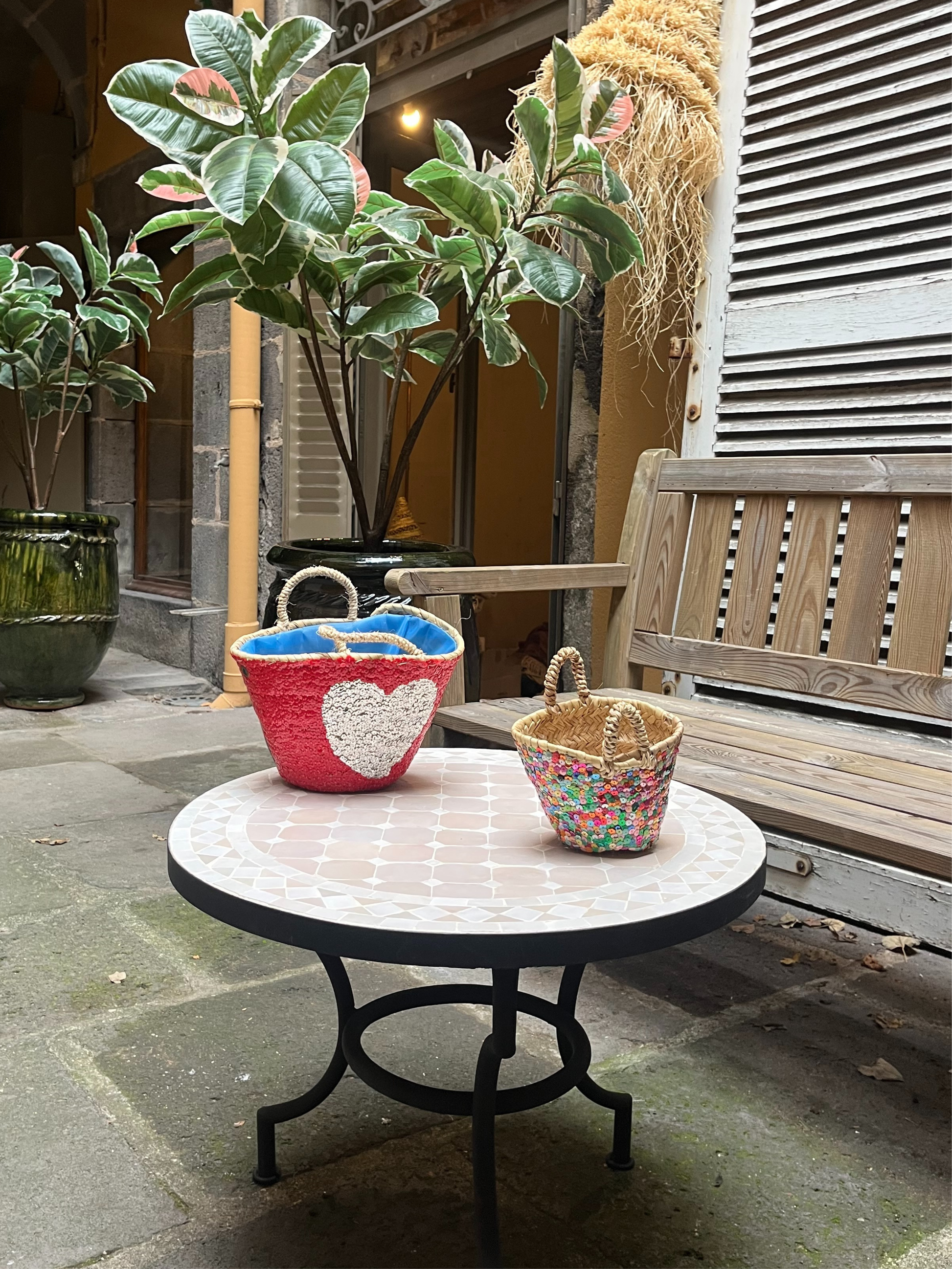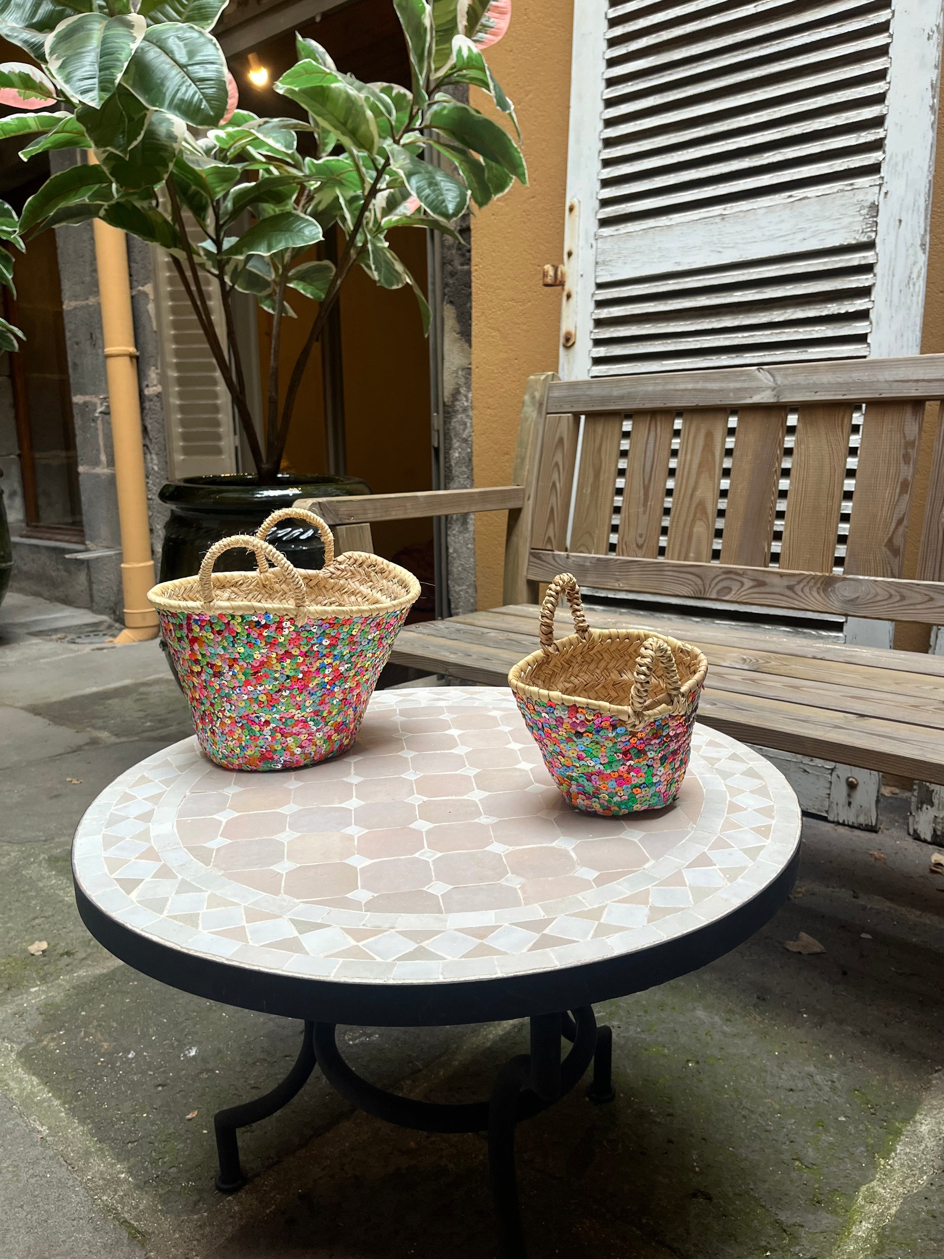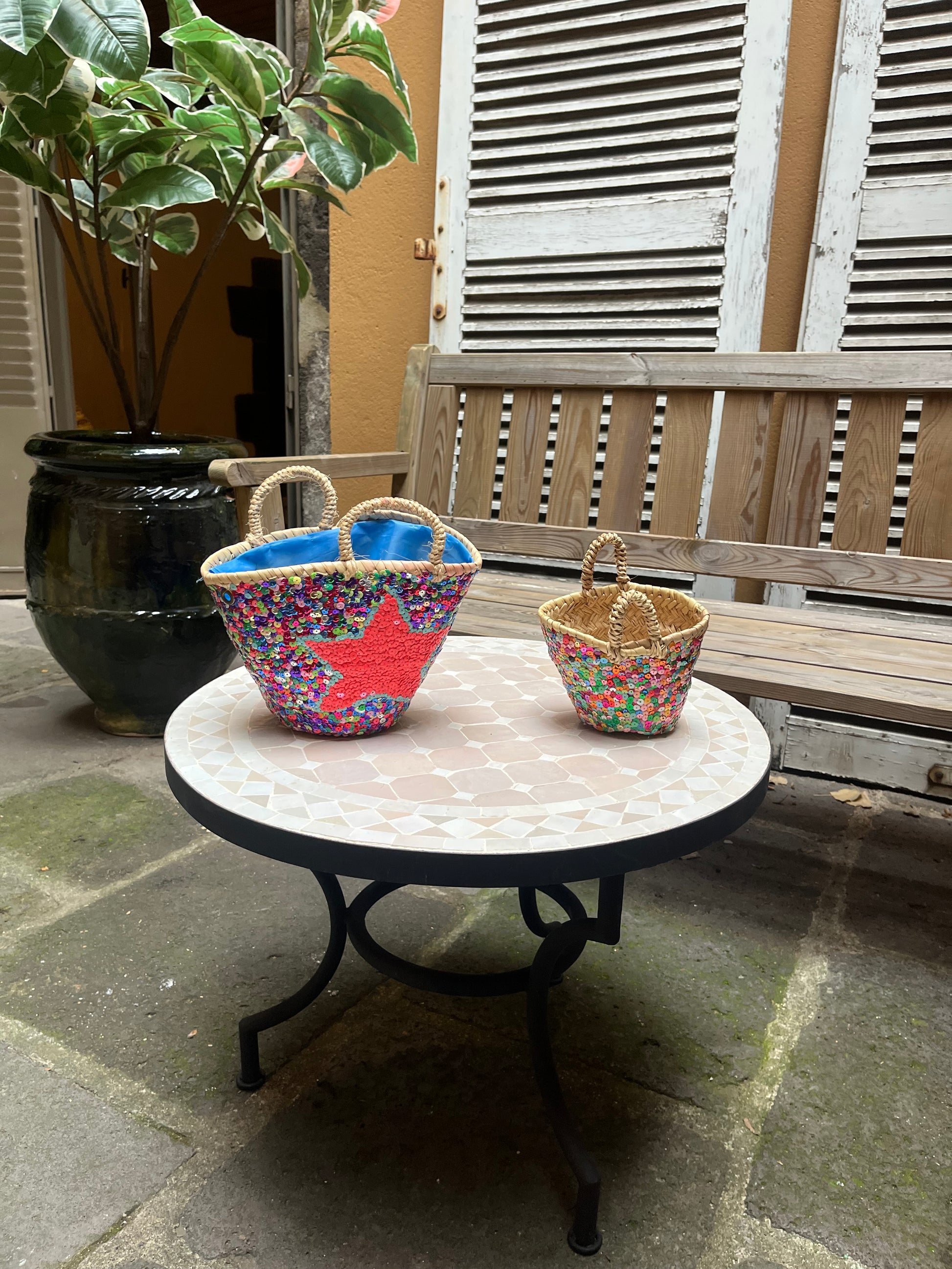 Fabrication : Réalisés à 100 % de manière artisanale au Maroc, ces paniers sont tressés à la main à partir de corde naturelle. Certains modèles sont doublés de toile de jute pour plus de solidité, tandis que des paillettes décoratives viennent parfois sublimer l’ensemble.