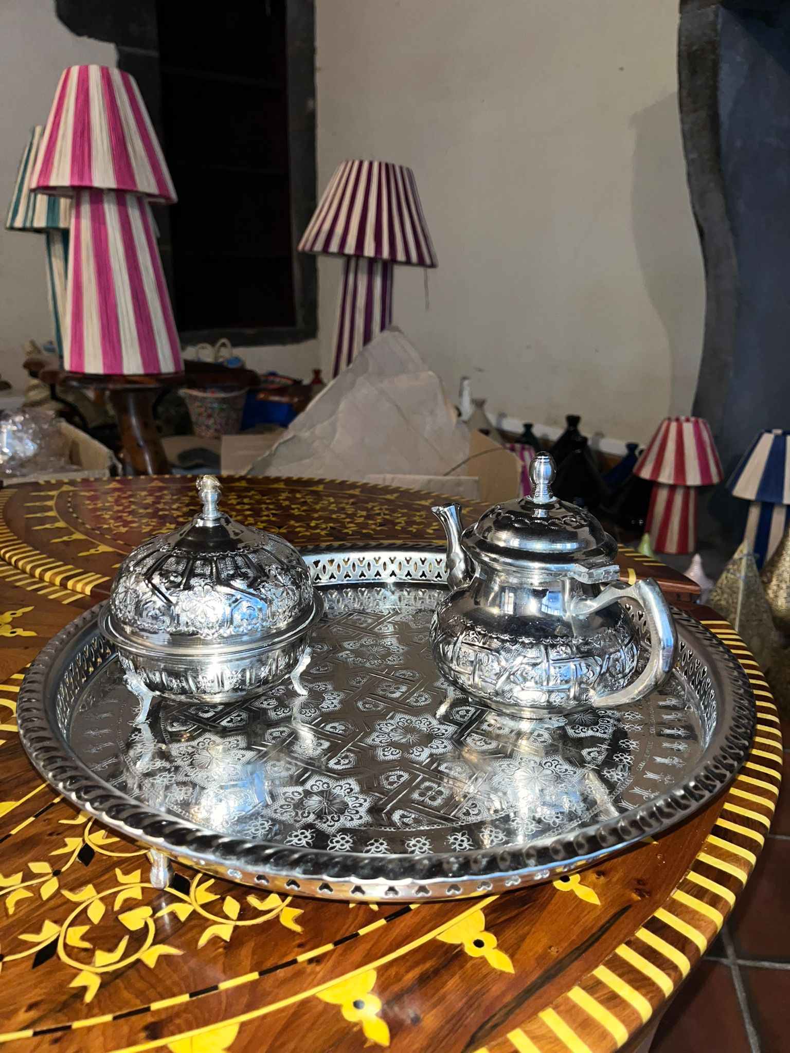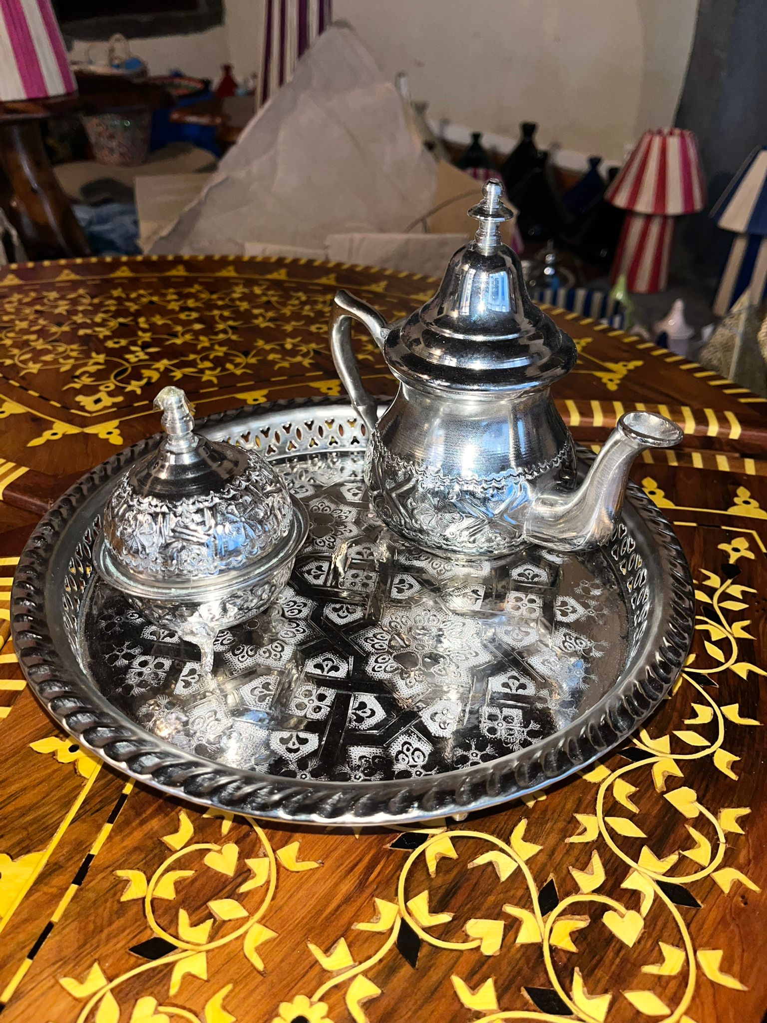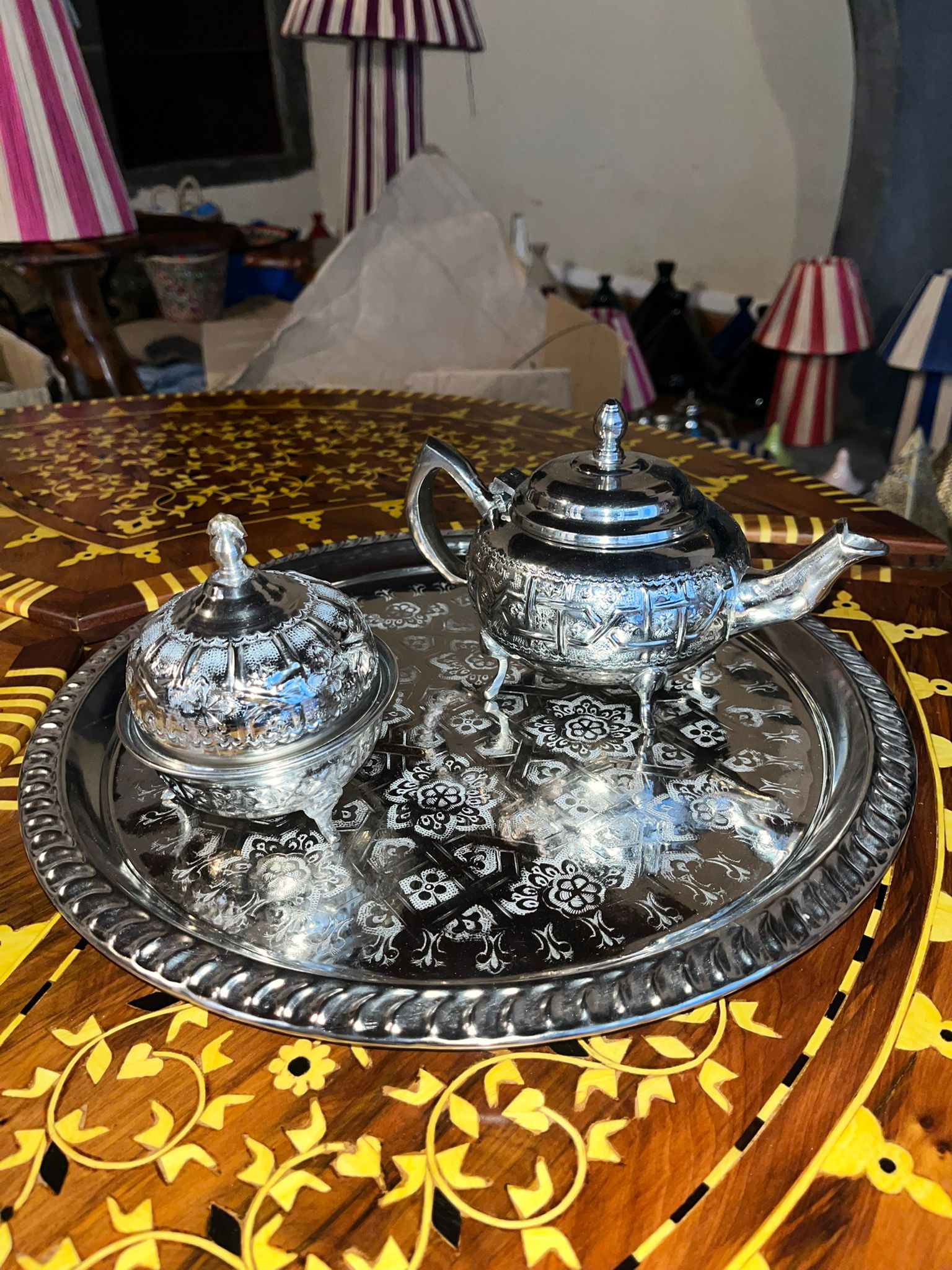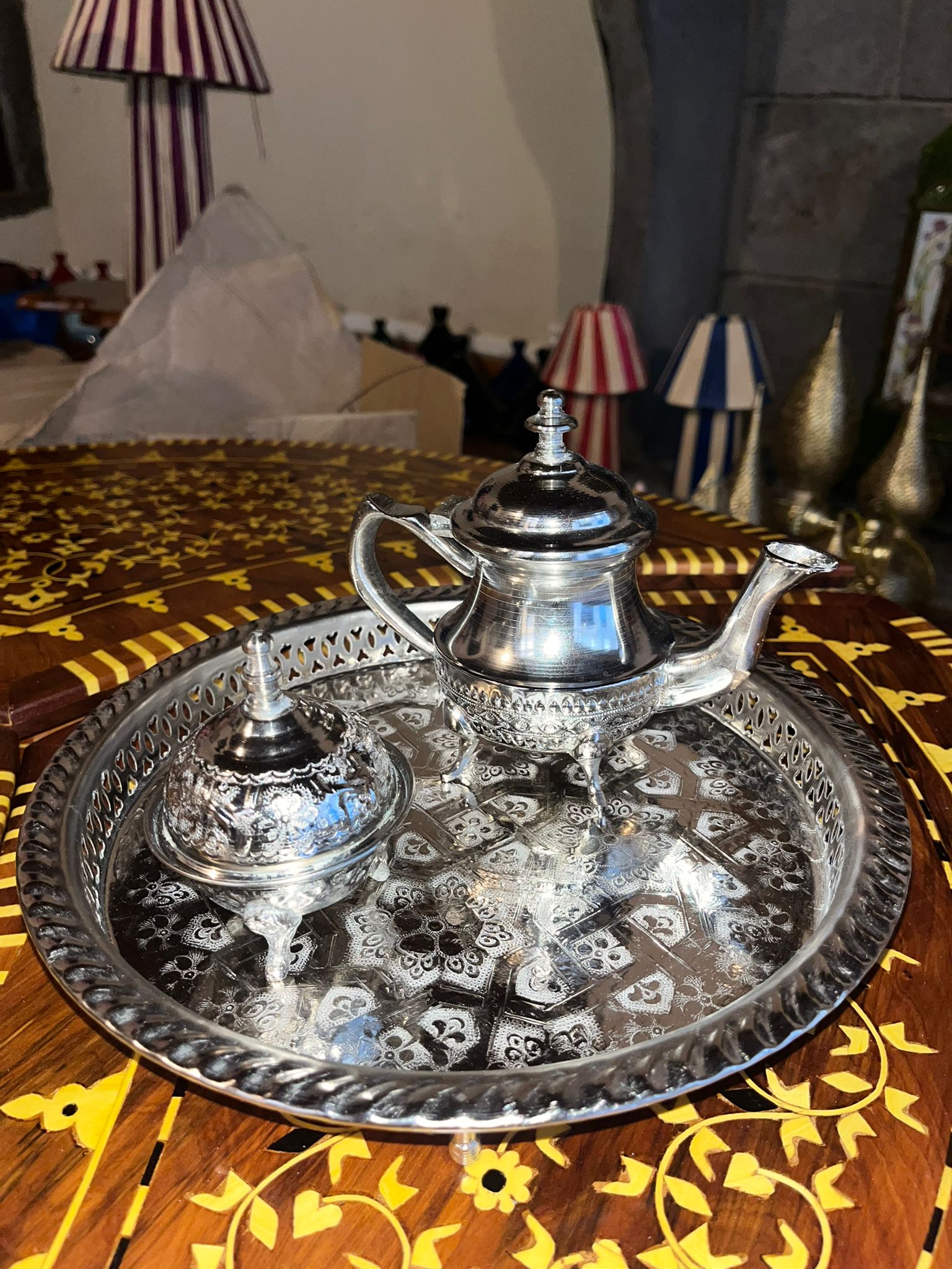 Ces services à thé, entièrement façonnés à la main au Maroc avec soin et passion, célèbrent l’élégance du savoir-faire traditionnel. Chaque set — composé d’un plateau, d’un sucrier et d’une théière — est unique et disponible en différentes tailles. Leur finition argentée ou métallisée leur confère une allure raffinée, apportant authenticité, chaleur et charme artisanal à votre intérieur. Parfaits pour servir le thé ou en tant que pièces décoratives, ils subliment instantanément votre table ou votre espace de vie.