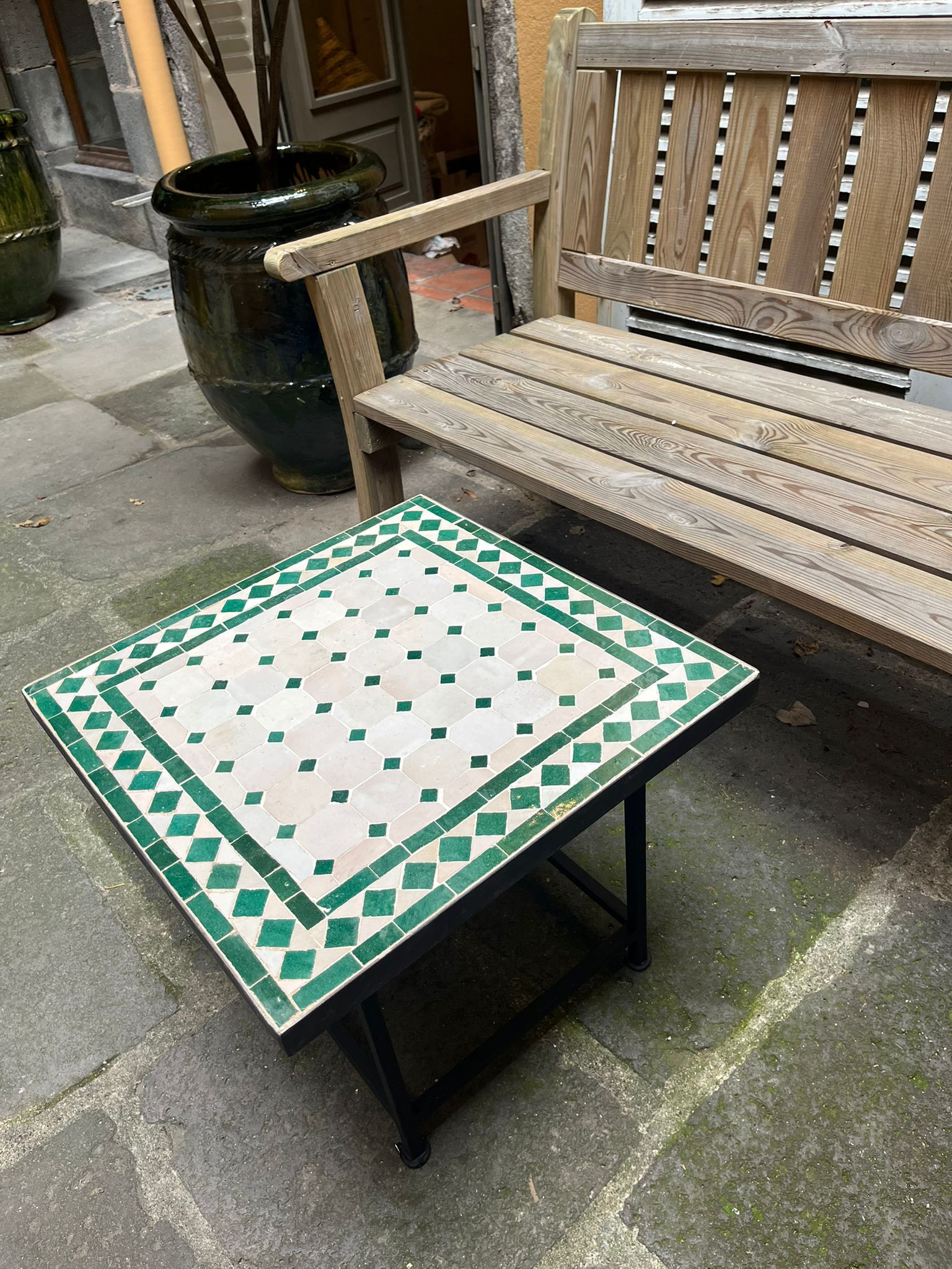 Matière : Fer forgé et céramique émaillée (zellige), sélectionnés pour leur résistance et leur beauté.