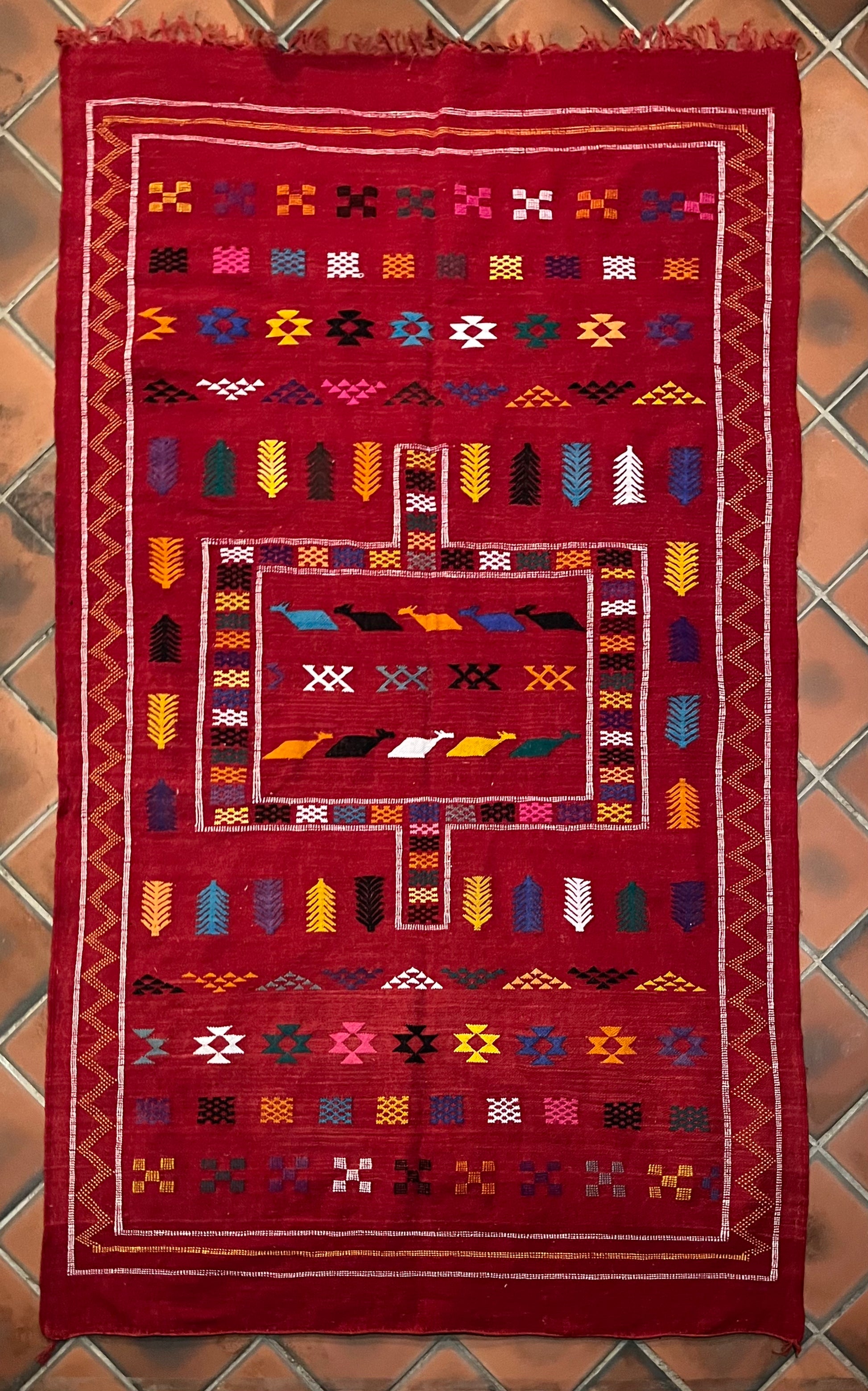 Réalisé à 100 % de manière artisanale au Maroc, ce tapis est tissé et noué à la main, teinté naturellement avec des pigments végétaux, puis orné de motifs symboliques inspirés des traditions berbères.